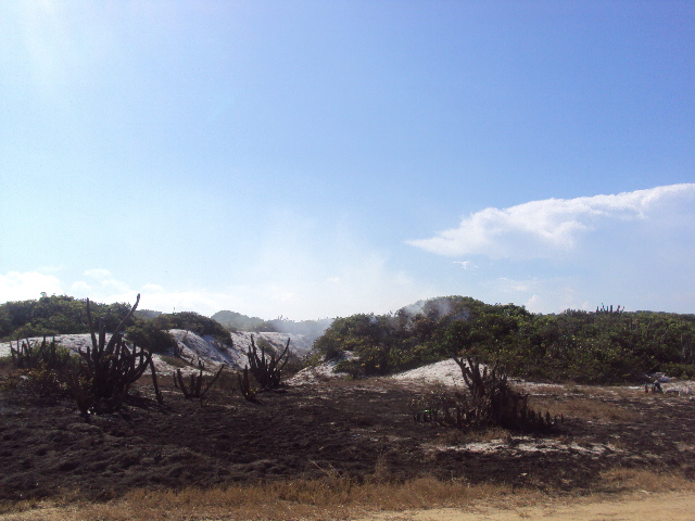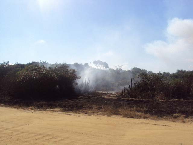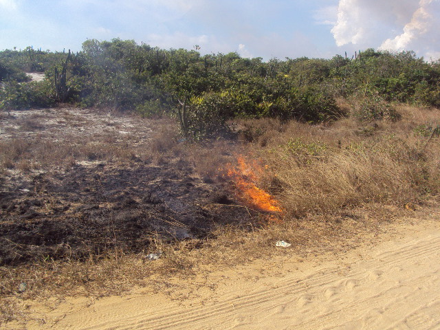 Muitas vezes, pessoas ateiam fogo sem motivo na restinga, o que compromete a Fauna e Flora local, destruindo o habitat de muitas espécies nativas.